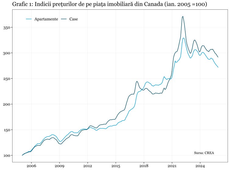 Un aspect important din acest punct de vedere este cel demografic. Măsurile de limitare a imigrației au condus la declinul accentual al ratei de creștere a populației, care a coborât recent sub zero, conform datelor de la Statistics Canada. Scăderea de 0,2% din T3 2025 este prima contracție din perioada postbelică, cu excepția perioadei pandemiei, ceea ce înseamnă un declin semnificativ al numărului de cumpărători.